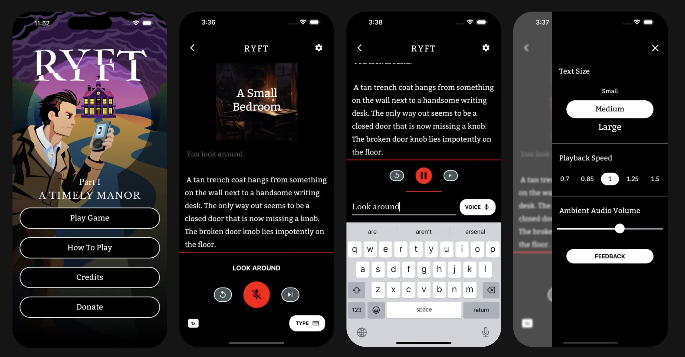 A voice-controlled, audio-based mystery adventure game. I co-designed the game engine, built a custom game editor with Electron, and developed cross-platform apps with React Native, Swift, and Java.